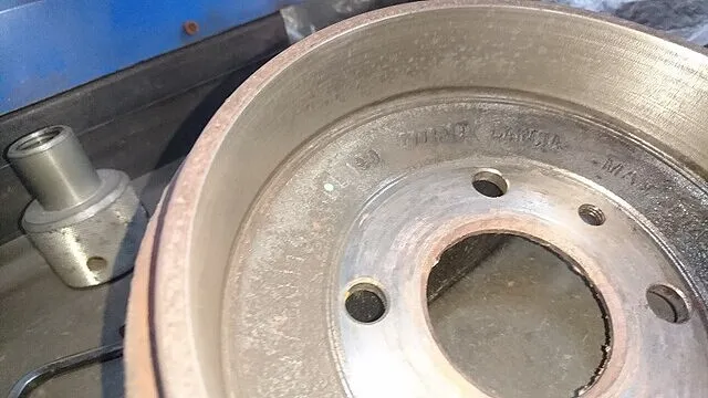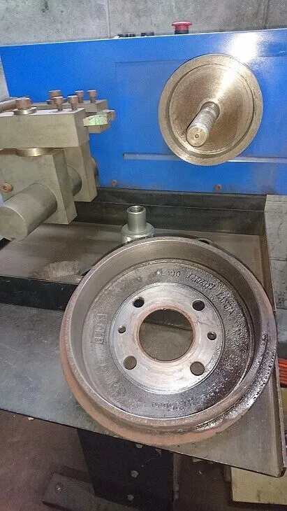リフトに乗せ、タイヤを取外し、リアブレーキドラムが歪み、段差などがございましたので当方で研磨機械でわずかながら削り、極力ブレーキシュー接触面を抵抗少なく仕上げてみました。