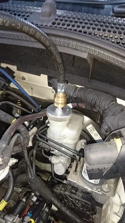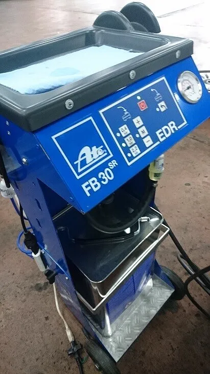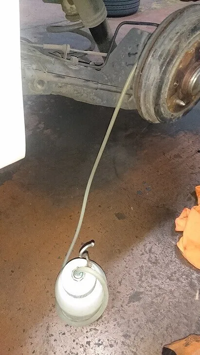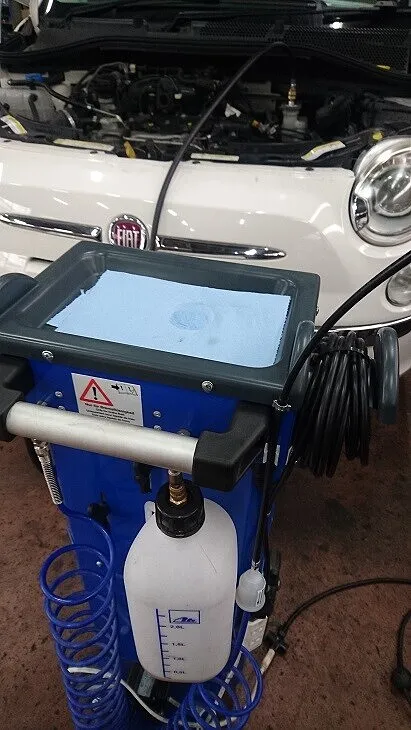 ブレーキフルードは必ず専用ブレーキフルード圧送機器を用いて4輪共から古いフルードを排出し、新しいフルードへ入替を行います。
